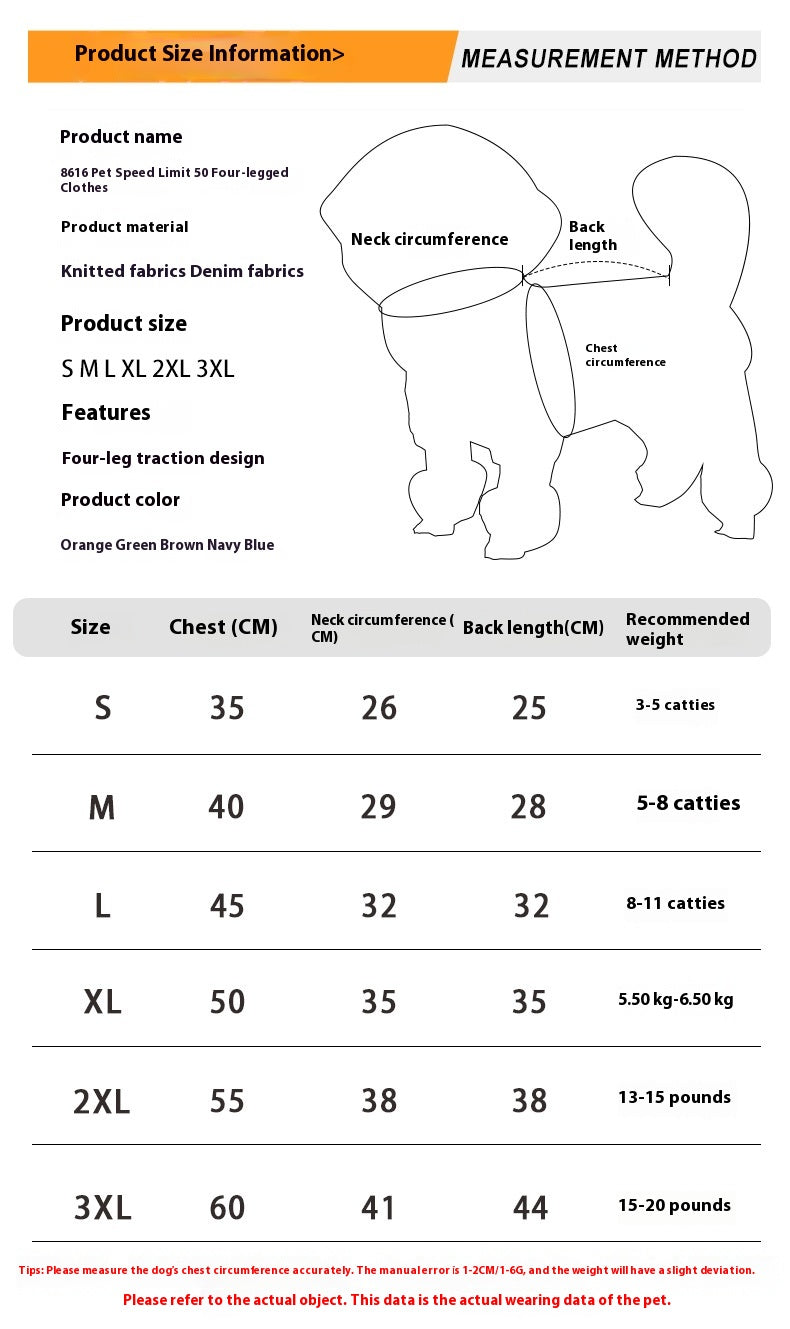 Product information: Color: green, orange, coffee, Blue Size: S (1.50kg-2.50kg, M (2.50kg-4.00kg, L (4.00kg-5.50kg, XL (5.50kg-6.50kg, 2XL (6.50kg-7.50kg, 3XL (7.50kg-10.00kg) Material: Polyester Style: Casual Category: pet clothing